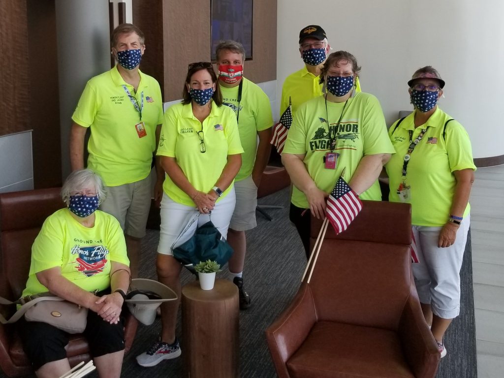 The ground crew who makes all the arrangements with the arriving flight for services provided by Washington Dulles Airport are just ordinary folks who love providing the opportunity for WWII, Korean, and Vietnam veterans to come to the Washington, D.C. area to visit the memorials created to honor their service. Here are some of our members from back in the COVID days (we’re not trying to hide our identities).